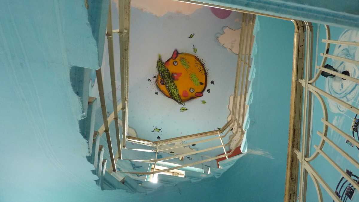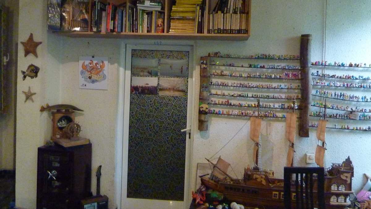 Locul: Odată pătruns pe ușa clădirii de la numărul 23, o să dai într-o casă a scării foarte interesant desenată: de la subsolul aflat sub apă, urci către nivelul mării de la parter și spre etajul luminat de soarele răsărit pe cerul tavanului. Recepția e la primul nivel, în holul livingului spațios, decorat interesant și relativ omogen, ținînd cont de diversitatea obiectelor de colecție expuse printre canapele, pe pereți, pe oriunde s-a găsit un loc disponibil. Machete de vase cu pînze, jucării de ouă Kinder, soldați din plastic… ce mai, un minimuzeu al copilăriei.