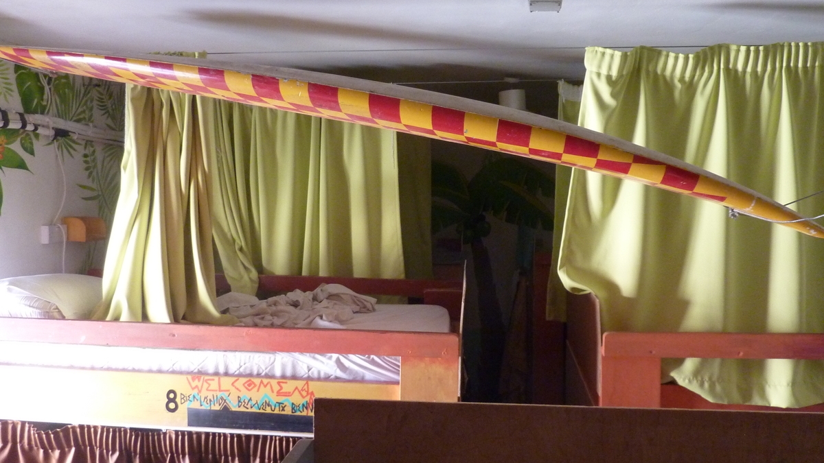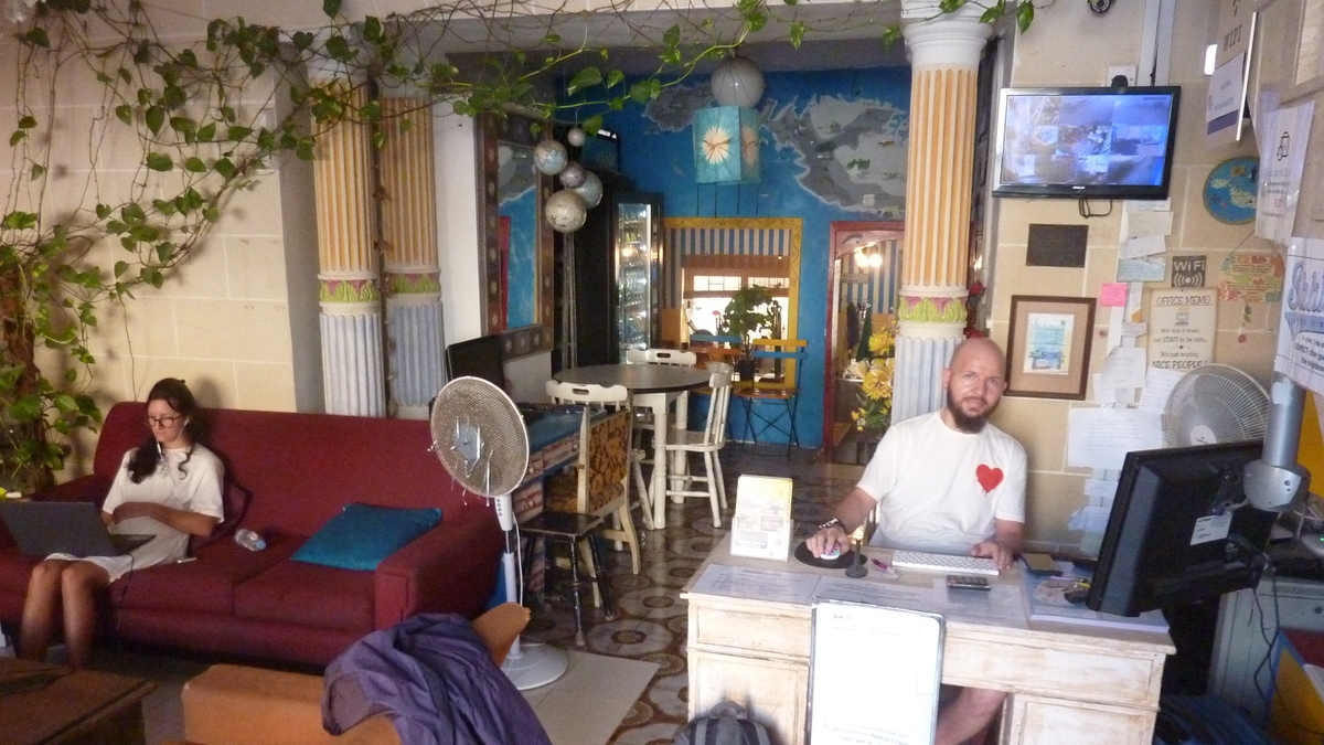 Dotările: Îngrămădit, ăsta e cuvîntul care descrie perfect interiorul lui Hostel Malti. Spații atît de mici, ca pentru chinezi subnutriți, or mai exista doar prin metropolele asiatice în care numărul locuitorilor îl depășește pe cel al metrilor pătrați construiți; și pe casa scării, și în camere, și la toalete, și în dușurile cît cabina telefonică în care, ca să încapi prin ușă – de fapt, prin deschizătura dintre pereți –, trebuie să intri într-o dungă. Deși se știe că pentru senzația de spațiu se montează oglinzi, ideea de a mai ameliora efectul deciziilor proaste ale arhitectului i-a venit autorului unor lucrări artistice populare (ca să nu zic de-a dreptul naive, cum sînt cunoscute, la noi, ilustrațiile țărănești) foarte colorate: prima noapte am dormit-o în dormitorul mixt umplut pînă la refuz cu paturi, șapte bunk-uri printre care trebuie să te strecori cu o agilitate de gimnast, decorat cu o placă de surf pictată vesel agățată de tavan și desenat, peste varul ușor sărit de pe tencuială, cu frunze de palmier, colibri și papagali.