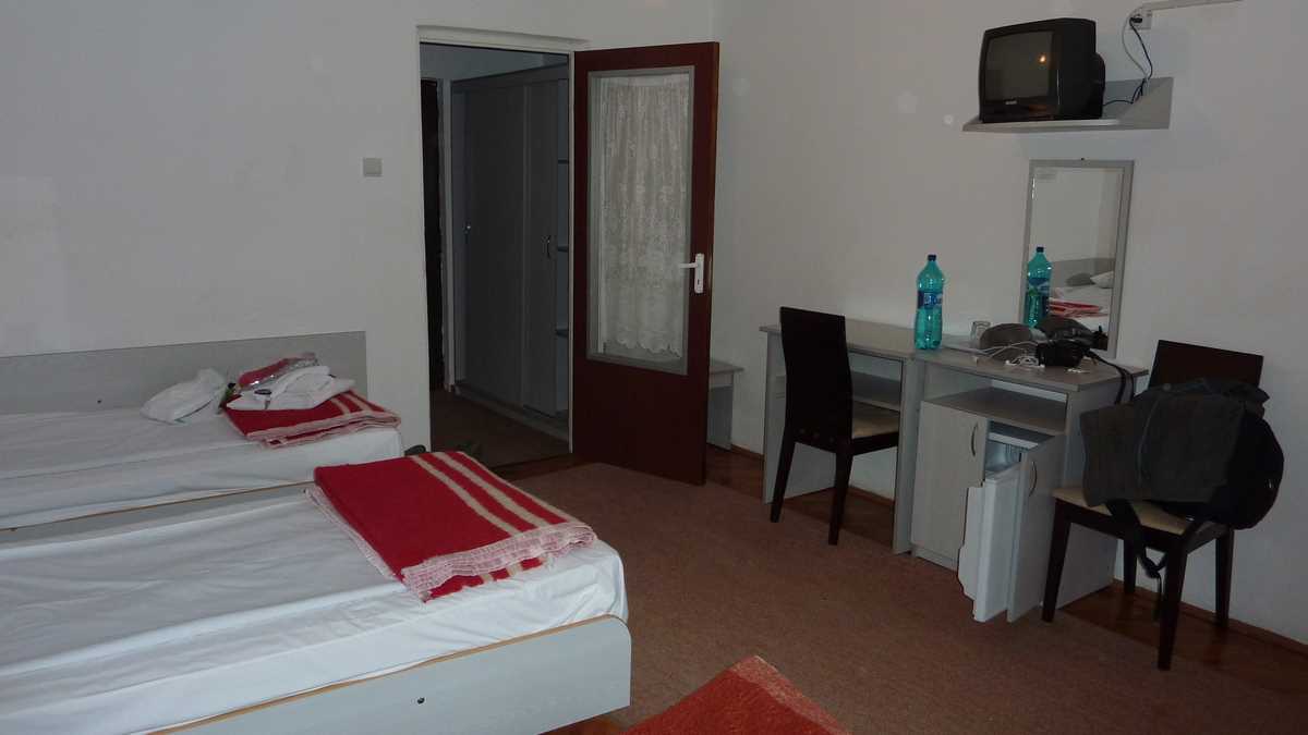 Dotările: Camera 102, cu balcon spre parcarea din față și acces direct pe copertina intrării în hotel, a fost recondiționată parțial, atît cît s-a putut. În sensul că, în momentul în care s-a ajuns la finisaje și dotări, s-au cam terminat banii. Nu că m-ar interesa foarte tare, dar sînt vag curios cine se mai uită azi la un televizor cu tub catodic diagonala 37 cm, în afara vizitatorilor unui muzeu al electronicii.