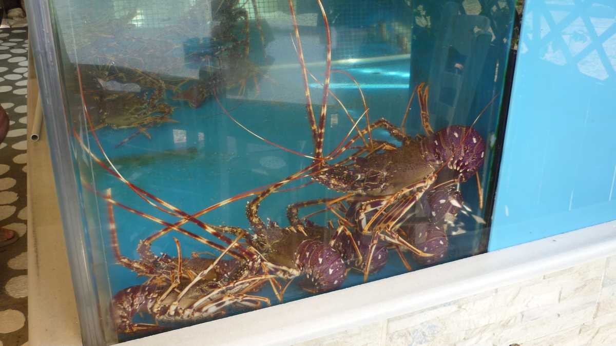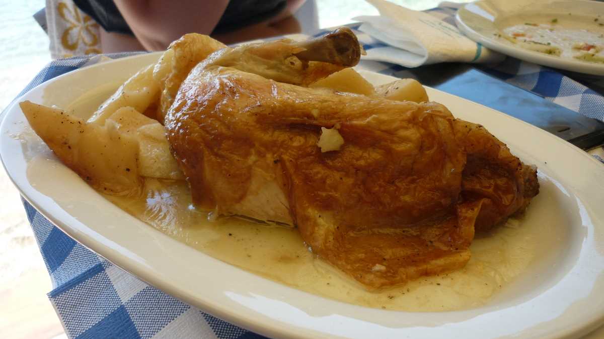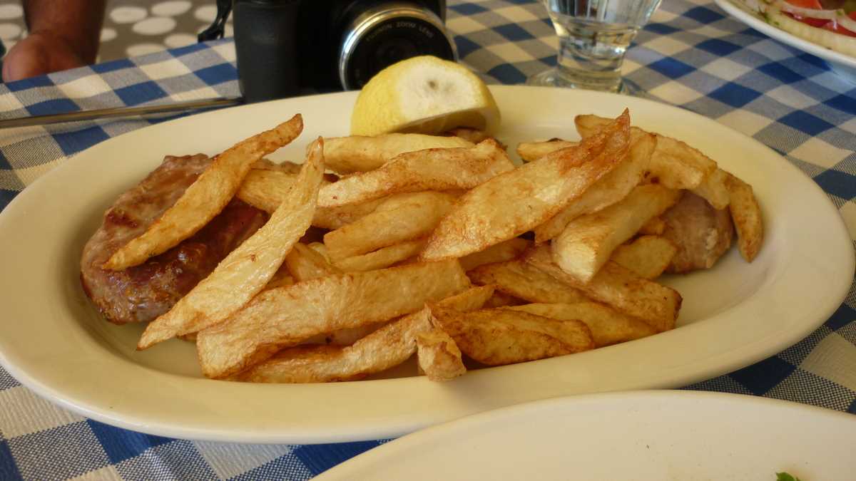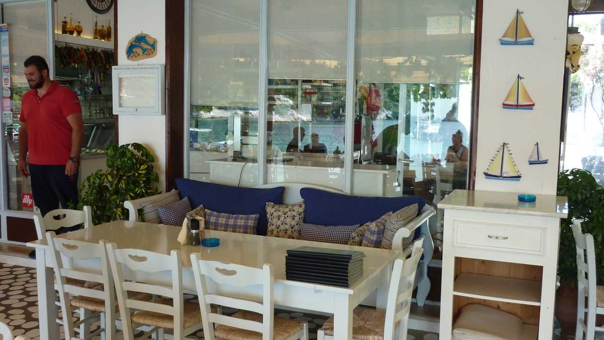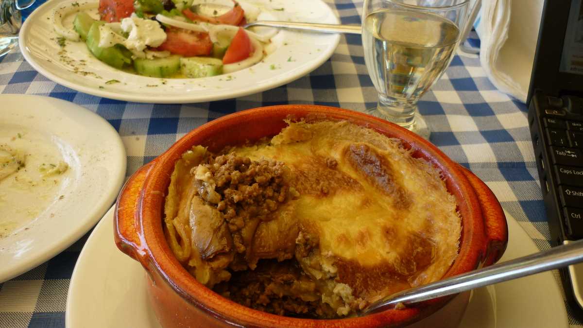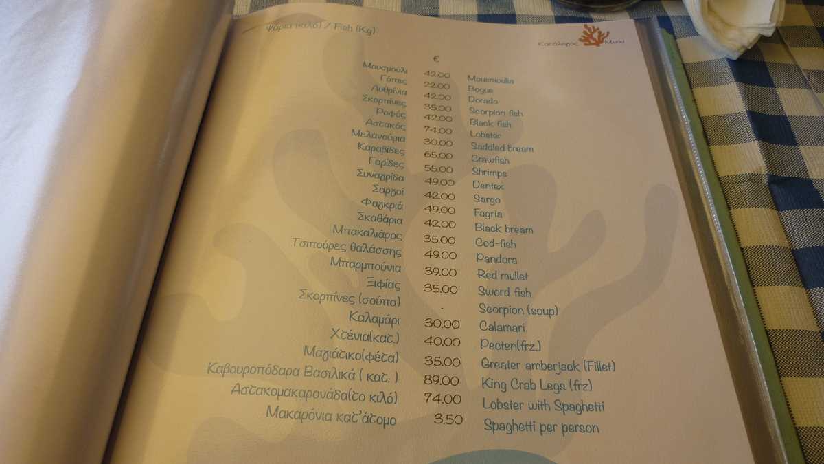Cu atîta apă în jur, meniul e, desigur, centrat în principal pe feluri (dez)ansamblate din peștele proaspăt pescuit, expus privirilor pofticioșilor într-o cuvă metalică, pe un pat de gheață, sau din prizonierii acvariilor imense de la intrare, creveții și homarii care-și așteaptă transferul în farfurii mișcînd lent din antene. Deci, pentru fanii fructelor de mare, ăsta ar fi locul perfect al unui dezmăț culinar de cinci stele. Pentru cei neimpresionați de oferta acvatică, pot să recomand ce-am testat eu de prin cea terestră, o salată grecească și o mousaka servită în vas de lut, ambele foarte bune. Prețuri (citez din meniul în engleză – pentru cel în greacă, n-am ochelarii de citit la mine): greek salad with tomato, cucumber, onions, feta cheese, olives and olive oil sprinkled with oregano – 5,60 euro, lobster spaghetti cooked with our traditional way – 24,80 euro; barrel of white retsina (1.000 ml) – 6 euro.