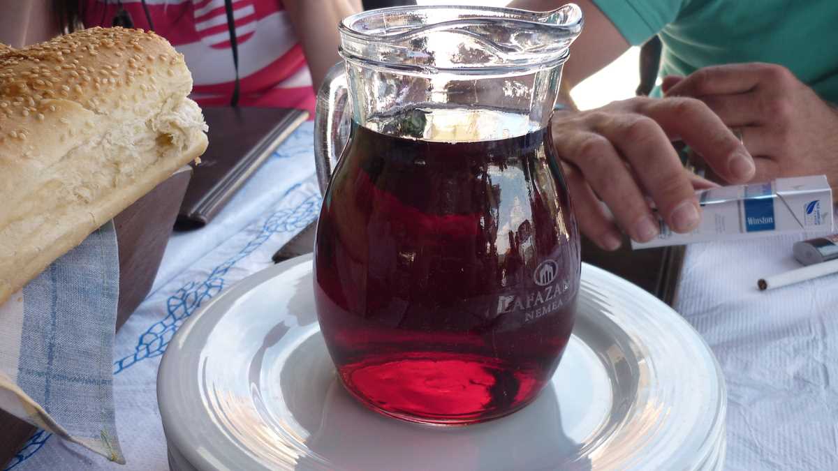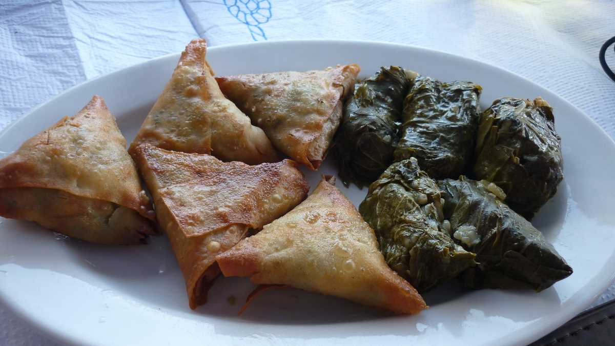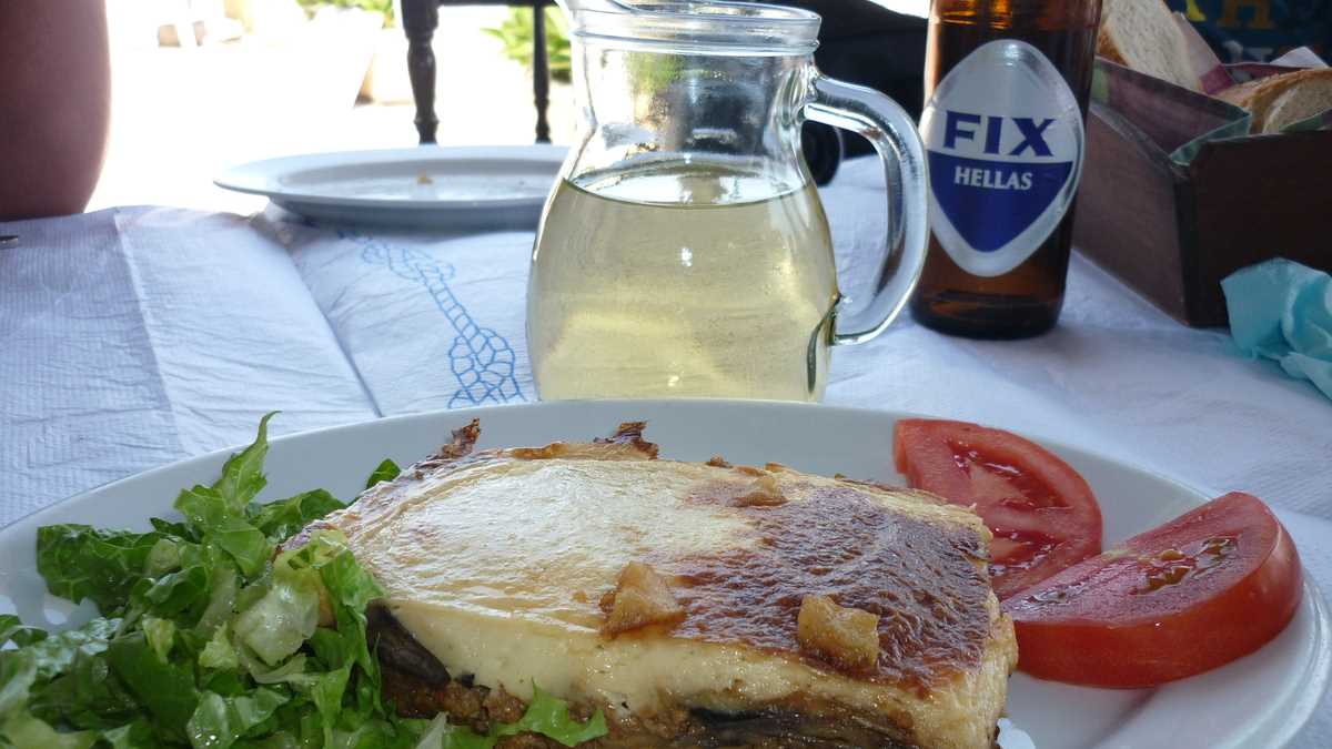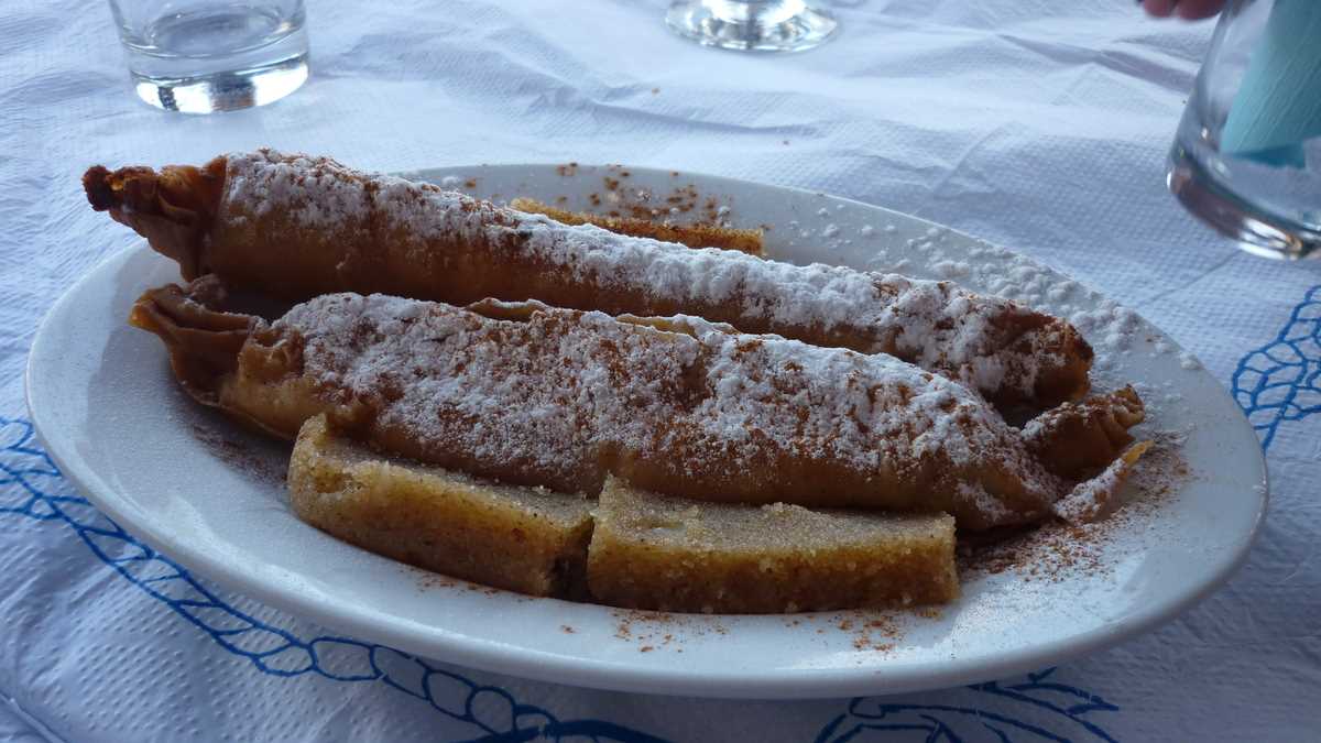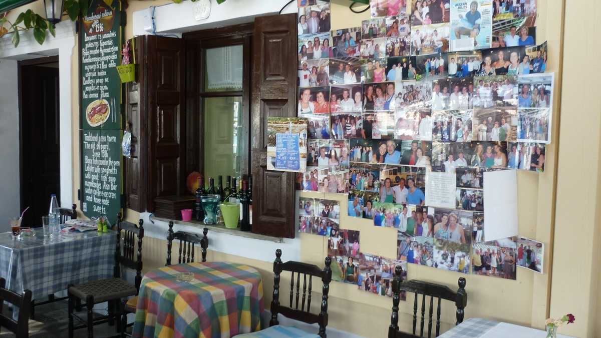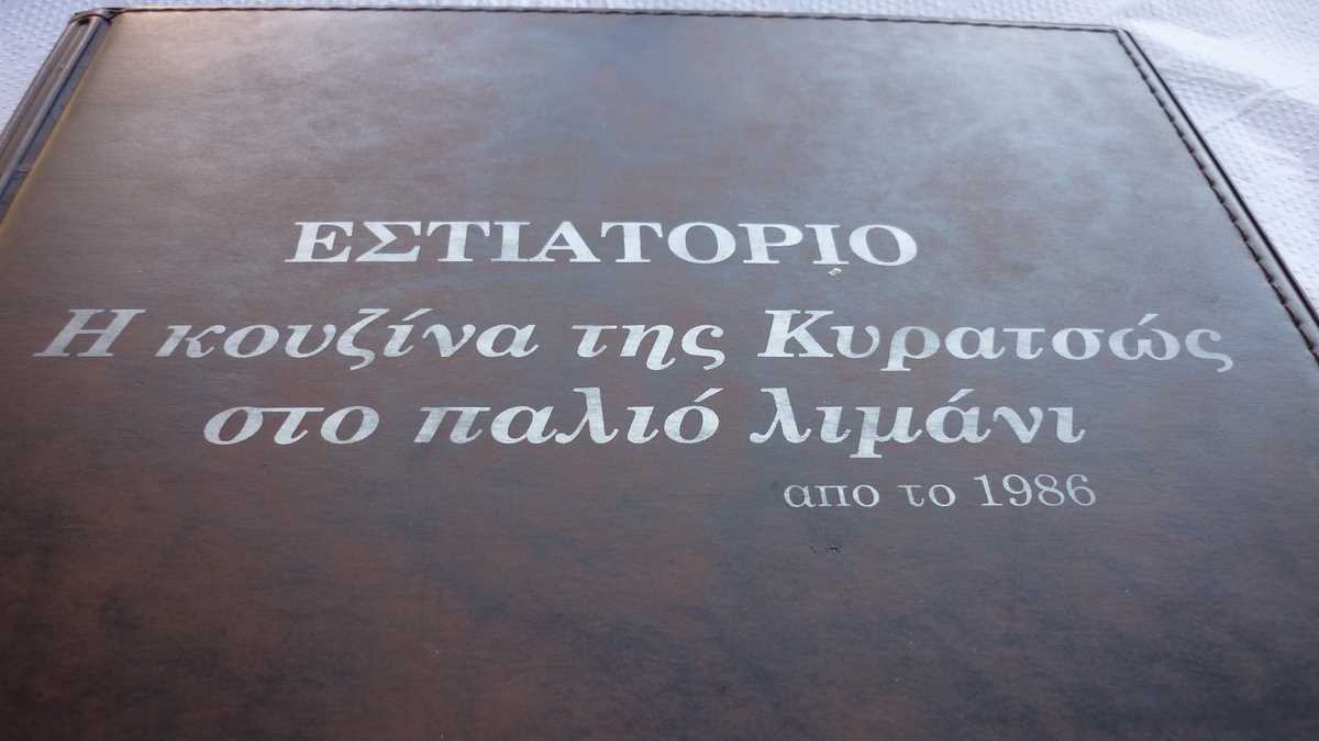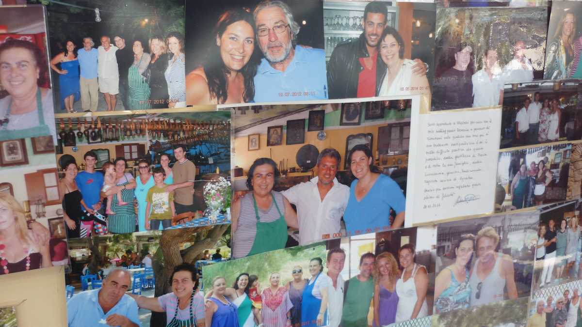 Revenind la masă odată cu comanda, să vă mai spun că din farfurii s-a mîncat, pe acorduri de sirtaki, mai mult pește, calamari, caracatiță sau scoici (cu excepția souvlaki-ului de pui care a aterizat în fața mea) și s-a băut vin alb și bere Fix Hellas. Din partea casei, au venit două platouașe cu sărmăluțe în foi de viță, lîngă un fel de merdenele cu feta și spanac, și încă două carafe de vin. Plus un lichior de trandafiri, la plecare, cînd a ieșit din bucătărie ca să facă poze cu noi însăși Kirața, vedeta panoului cu fotografii din fața tavernei în care mai apar cîntăreți, fotbaliști și actori mai mult sau mai puțin cunoscuți. După cîte poze are Raging Bull cu celebra bucătăreasă, am avut senzația că am mîncat la mama lui De Niro.