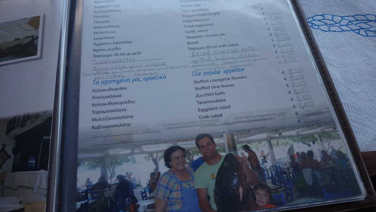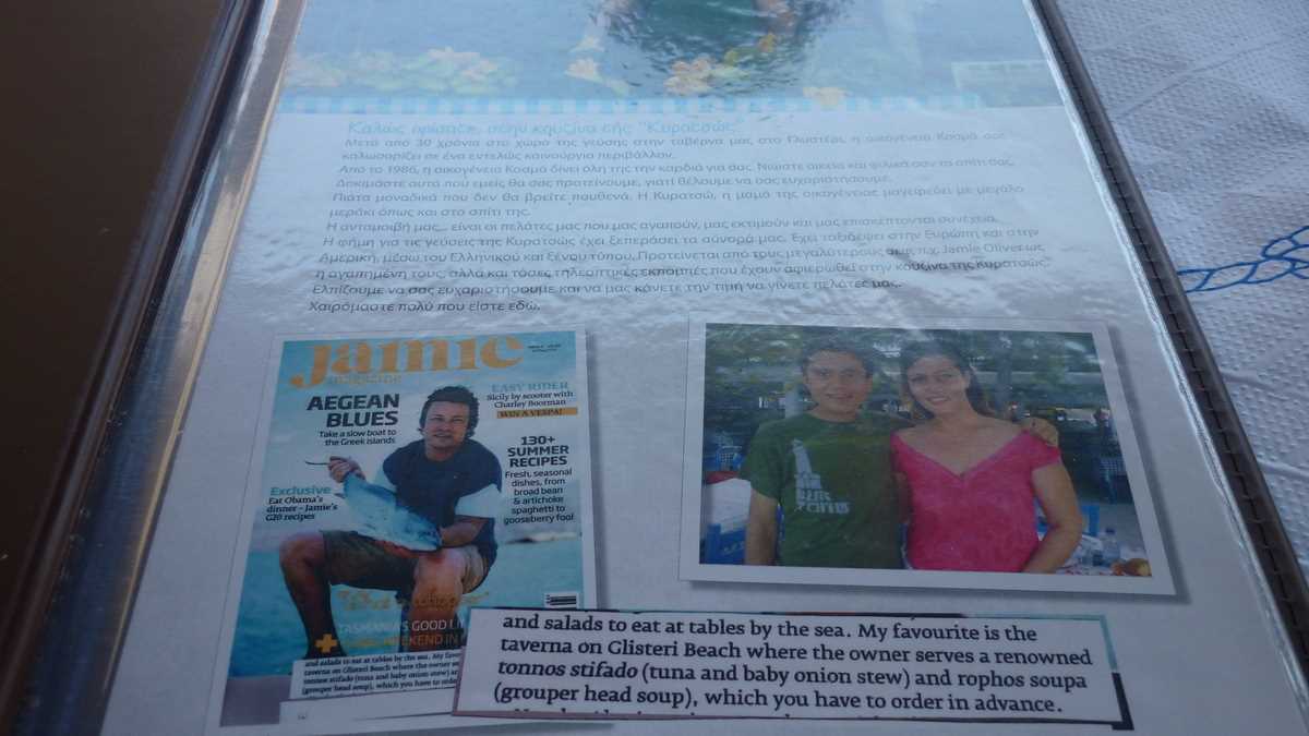 Pînă ne-a venit comanda, am stat de vorbă cu Maria. Cică Jamie Oliver a mîncat aici, fără să fie recunoscut, și apoi a scris în revista lui că e taverna sa favorită din Skopelos. Au aflat abia după ce a sunat-o o prietenă londoneză: “Wow, am citit despre voi în Jamie Magazine!”. Inițial, taverna a fost deschisă în 1986, pe plaja Glisteri din nordul insulei, dar s-au mutat aici acum cîțiva ani, după ce au fost evacuați de acolo cu mascații, la 5 a.m. N-a contat că tatăl ei era cardiac și ea însărcinată; procesul se judecă de atunci și a ajuns la CEDO. Și toate astea pentru că un mare prelat din zonă pusese ochii pe proprietatea lor. Se vede treaba că Biserica greacă preferă lemnul și tavernele mici.