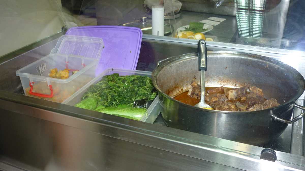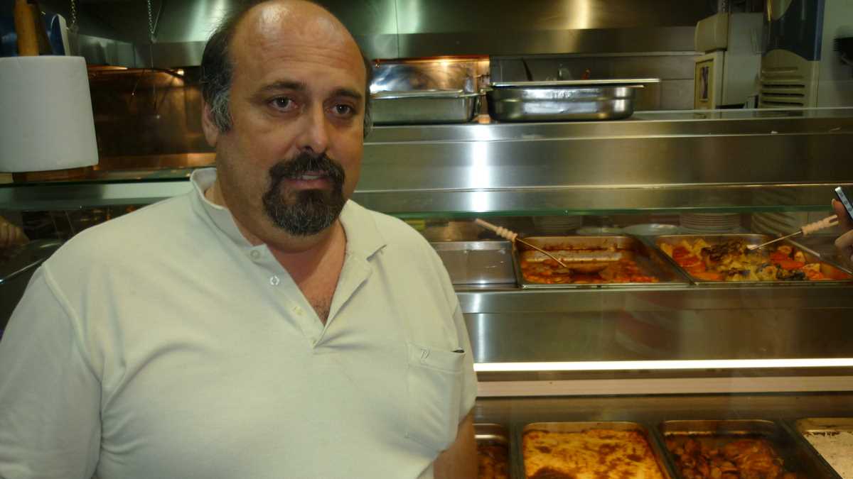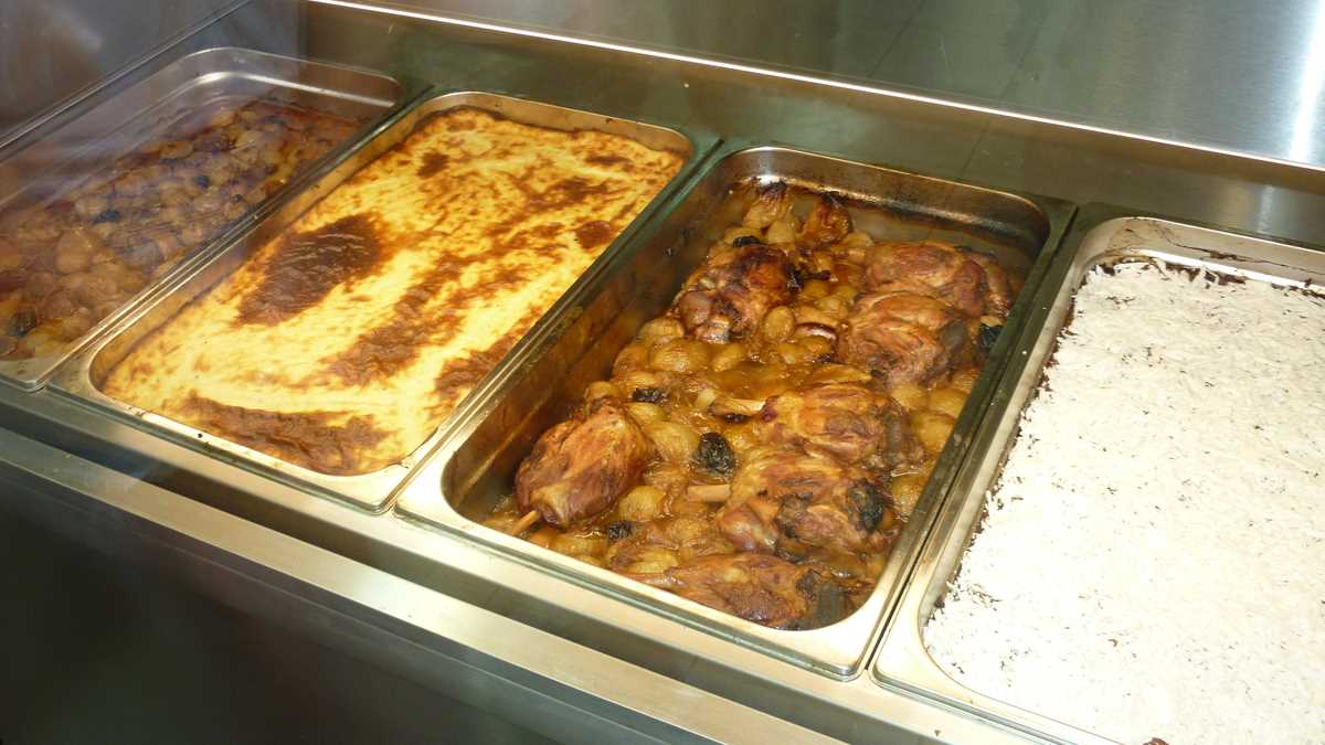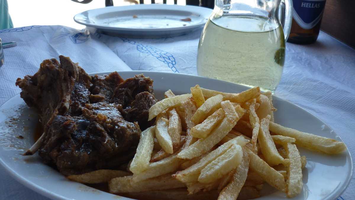 Aici se află taverna din episodul de astăzi. Mai exact, în port, la extremitatea stîngă a promenadei de pe faleza din Skopelos Town, cum te uiți la mare, chiar în capăt, peste drum de statuia lui Manolakis (nu-l știți voi, persoană importantă), un nene îmbrăcat militar, mort în primul război mondial. Tavernă tipic grecească, cu mese apropiate și sunet de bouzouki în boxe, Kyratso’s Kitchen e o afacere de familie. Familia Kosma: mama, fiica și ginerele. Ne-am așezat pe terasa lor pentru un prînz tîrziu, complet întîmplător, acostați amical de Maria, care împărțea pliante trecătorilor, și, înainte de a deschide meniurile, soțul ei ne-a invitat înăuntru ca să ne prezinte bucătăria și specialitățile casei, drept răspuns la întrebarea noastră nerostită: What’s cooking, duck? De fapt, What’s cooking, goat?, pentru că piesa de rezistență a chef-ului este rețeta locală de capră în sos de roșii (13,50 euro), gătită chiar de mama Kyratso (probabil, Kirața, în original).