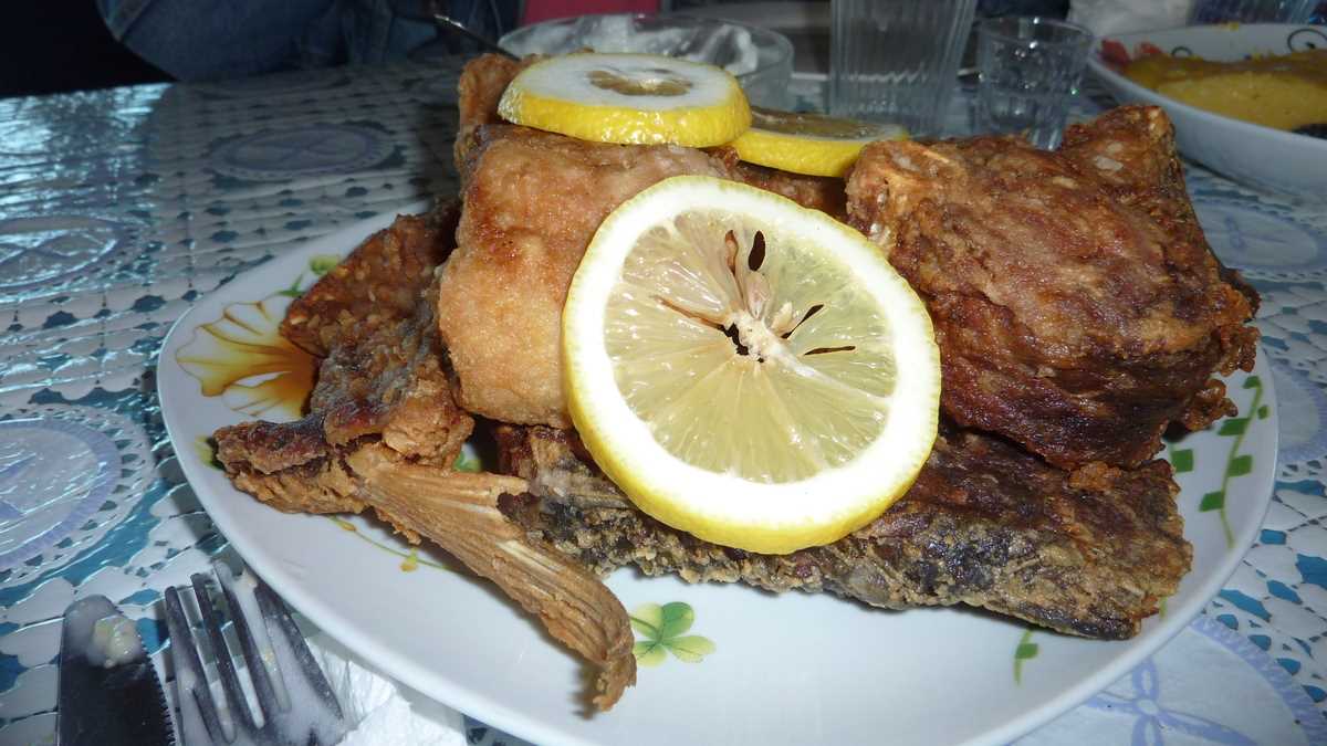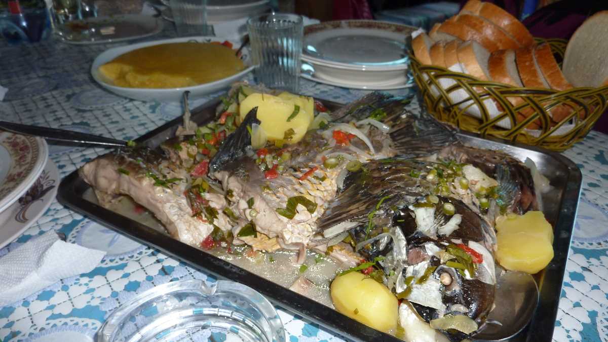 Zdruncinata plimbare cu căruța a făcut loc în stomac mesei de prînz. Returul în sat are stație finală la tanti Viorica, pensiunea familială punct gastronomic local la care se mănîncă după meniu fix, o gospodărie tradițională din lemn, chirpici și stuf vopsită albastru, cu mese în curte, sub umbrar, și poartă permanent deschisă. Vizitatorii hămesiți intră în ograda largă, colorată de ghivecele cu flori, și trag cu ochiul nerăbdători, după gard, la ceaunele bucătăriei de vară open space în care clocotește borșul de pește ce va ajunge pe masă servit separat – dedesubt, farfuria adîncă umplută cu supă de polonicul din castron, deasupra, farfuria plată în care alegi conținut de pe tava cu peștele tolănit lîngă cartofii fierți. Felul ăsta compus din două feluri se mănîncă, cică, după un ritual aparte: mai întîi carnea, dezosată cu degetele și întinsă prin sosul gros, aproape pastă, de smîntînă cu mujdei, și abia apoi zeama asortată cu un ardei iute (și, opțional, oțet, ca pentru ciorba de burtă a mahmurului). După ce ți-ai lins degetele și farfuriile, urmează mămăliga cu bucăți de crap/somn prăjit stropite cu lămîie, gogoșelele desertului și vinul alb de Sarica Niculițel care închide masa copioasă cu rețete clasice de Deltă, pentru oaspeți simandicoși.